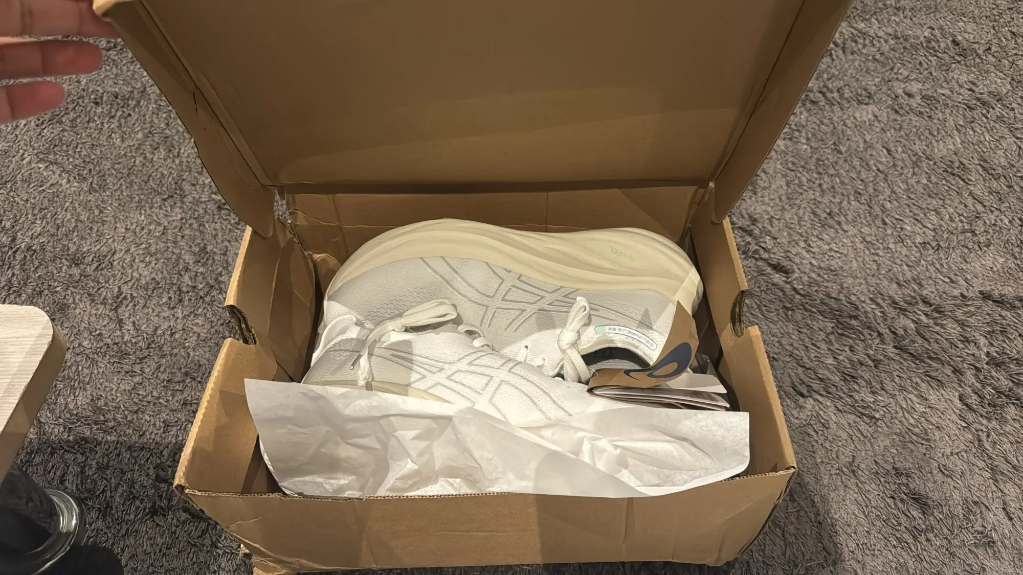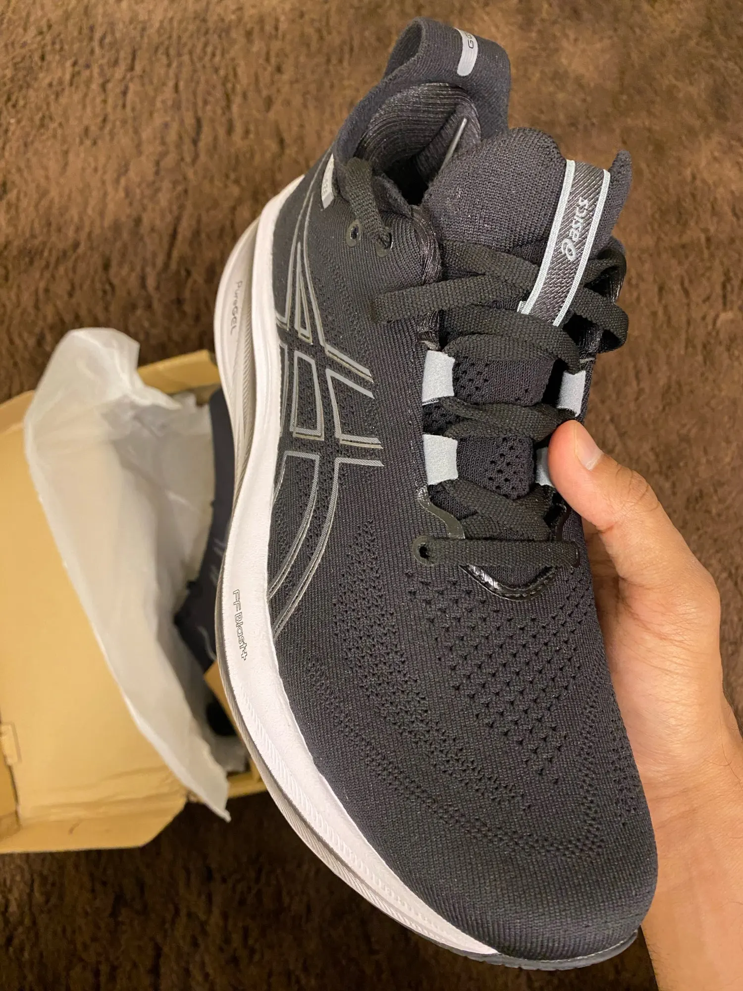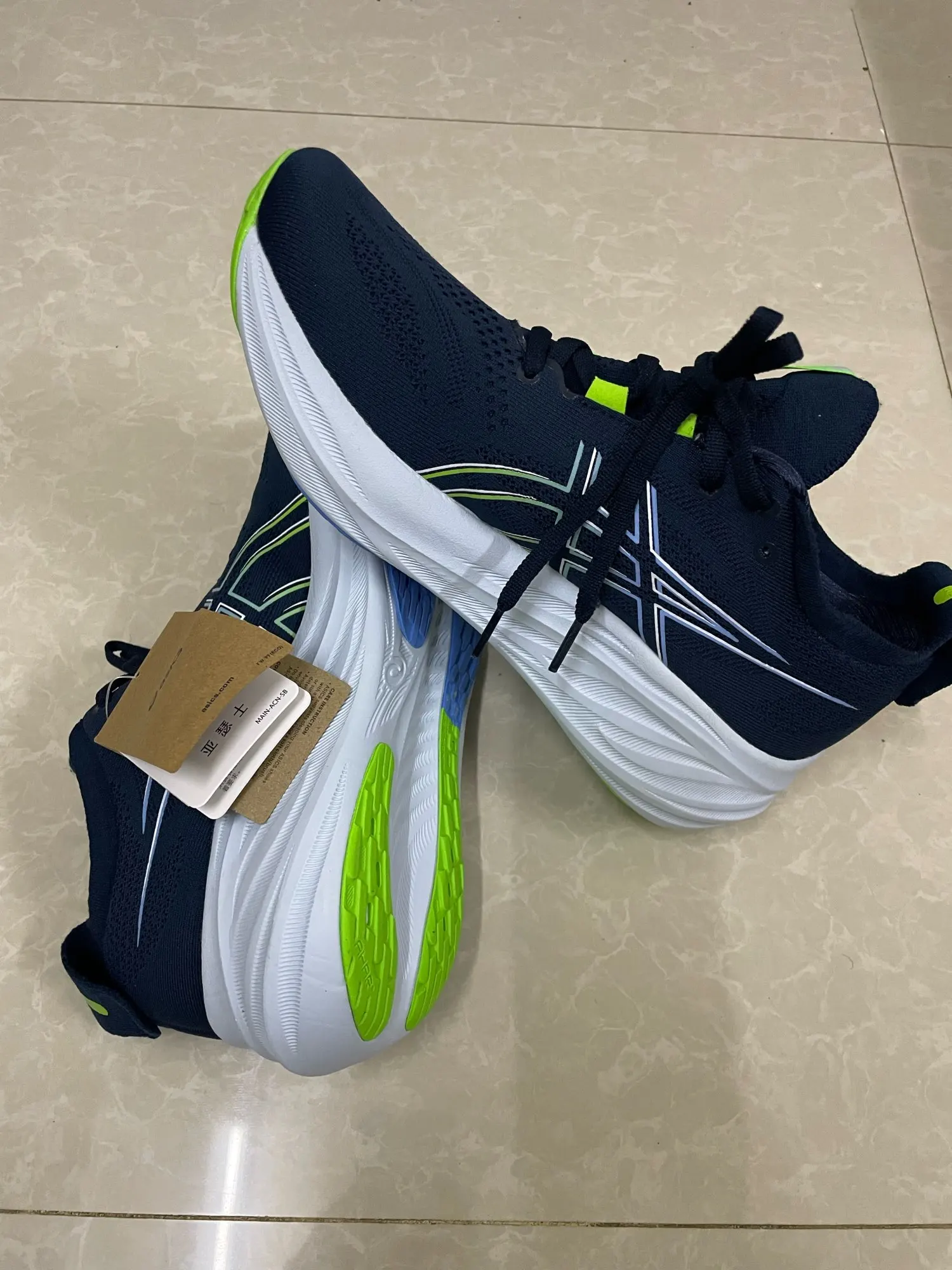 الجزمة رهيبة جدا و جميلة كجودة الله العالم إنها أصلية من التفاصيل و اضح الشغل ممتاز جدا و خفيفة على شأن تجيك بالكرتون ضروري بعد الطلب تكلمه خاص و تقوله يجيب معها الكرتون ، و للعلم الجزم تجي فيتنام و بعضها إندونيسيا و هذا موجود بالأساس في موقع أسيكس الياباني