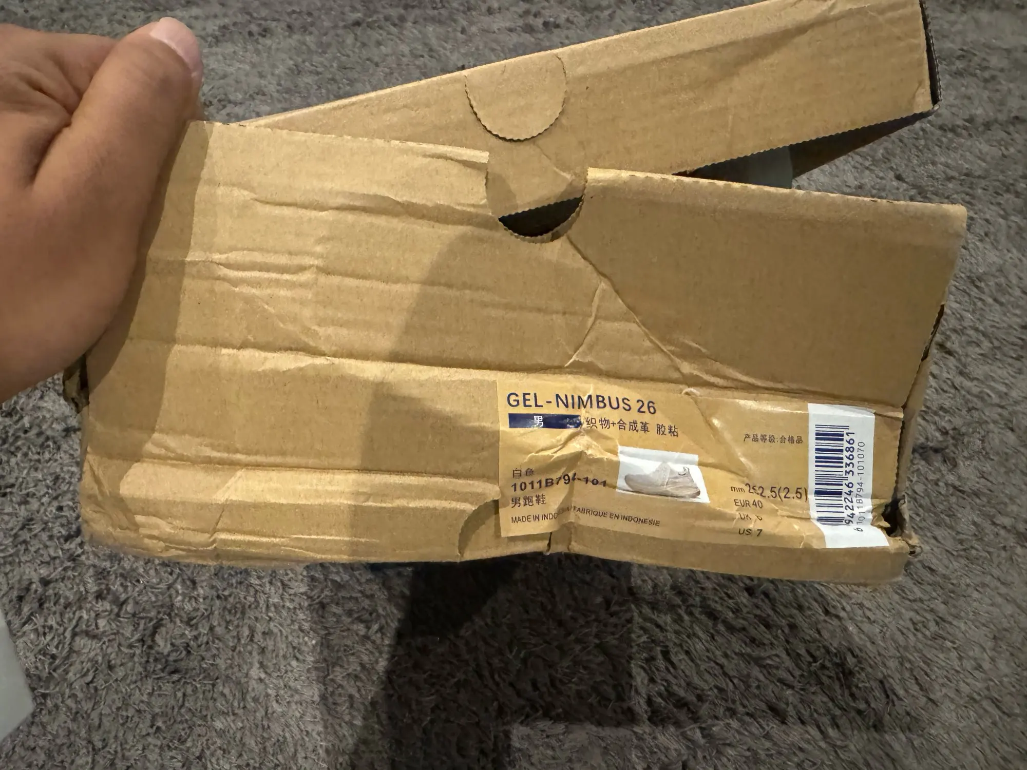 لقد تم استلام الاحذيه بدون كرتون مكتوب عليهم وفيتنامي والثاني اندونيسي لكن جوده الاسود مريح جدا