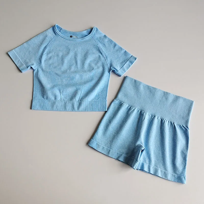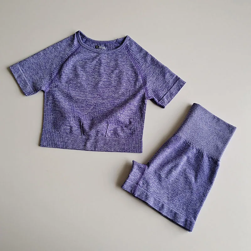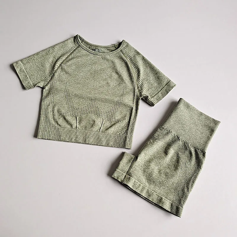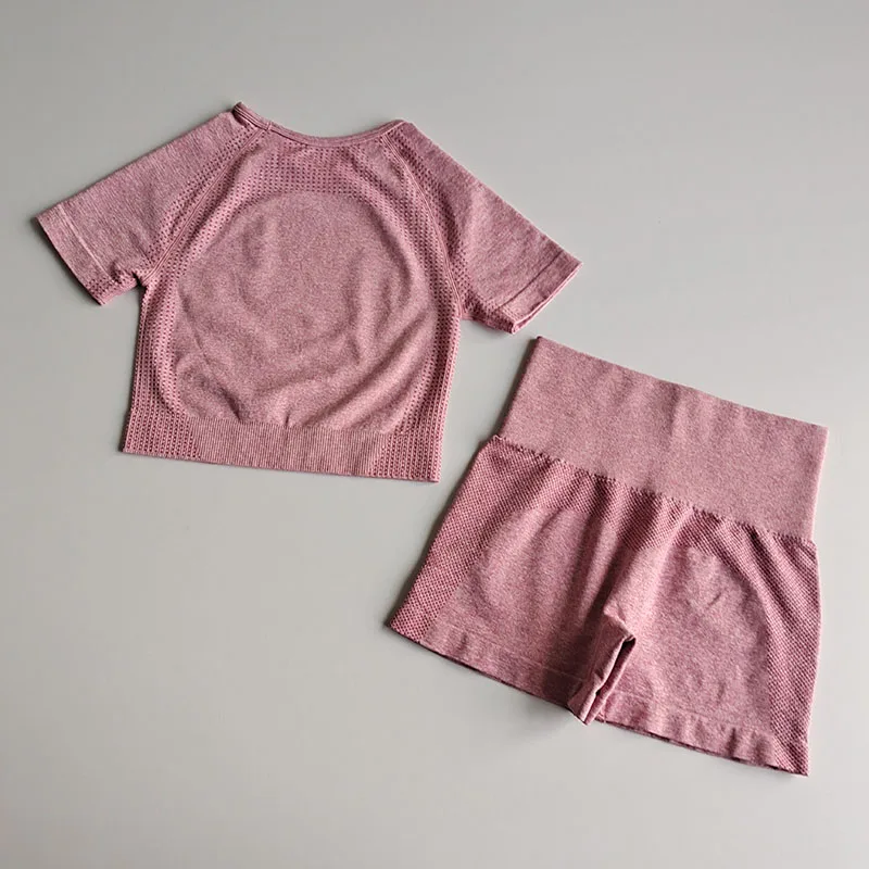 رائجة البيع 2 قطعة/المجموعة النساء عالية الخصر سلس اليوغا مجموعة ملابس رياضية اللياقة البدنية قميص قصير الأكمام السراويل الرياضية الدعاوى ملابس رياضية